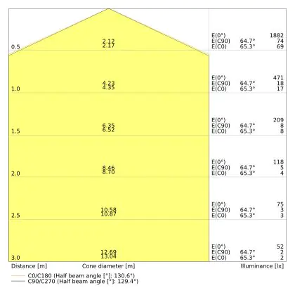 De lichtopbrengst (Lumen), geeft weer hoe krachtig het uitgestraalde licht is. Dit is belangrijk om te weten om de juiste sfeer te creëren. 0 tot 400 Lumen is bij uitstek geschikt voor accent- of sfeerverlichting. Een hoger aantal Lumen is, afhankelijk van de grootte van de ruimte, beter geschikt als ondersteunende- of basisverlichting. Heb je plafonds hoger dan 4 meter, dan is een lichtopbrengst van minimaal 8000lm aan te raden indien heldere verliching gewenst is (vb. in werkomgevingen).