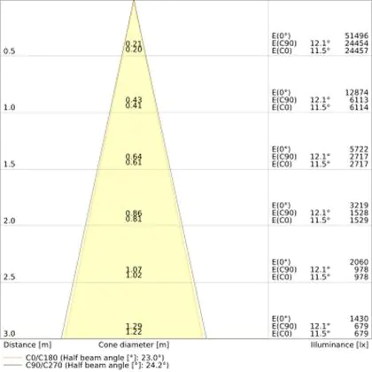 De gradenbundel geeft informatie over hoe breed het licht wordt uitgestraald. Dit zit tussen de 0 en 360 graden (D). Hoe kleiner de hoek, hoe specifieker de lichtbundel is. Over het algemeen is een smalle gradenbundel perfect voor sfeer- of accentverlichting, terwijl een brede gradenbundel ideaal is om grote oppervlaktes te verlichten.